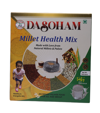 Dasoham Millet Health Mix is a premium blend of millets, cereals, pulses, and nuts created through careful selection and process. This ensures the highest natural purity while preserving an abundance of nutrients and antioxidants, resulting in zero artificial additives and a rich source of vitamins and minerals.
